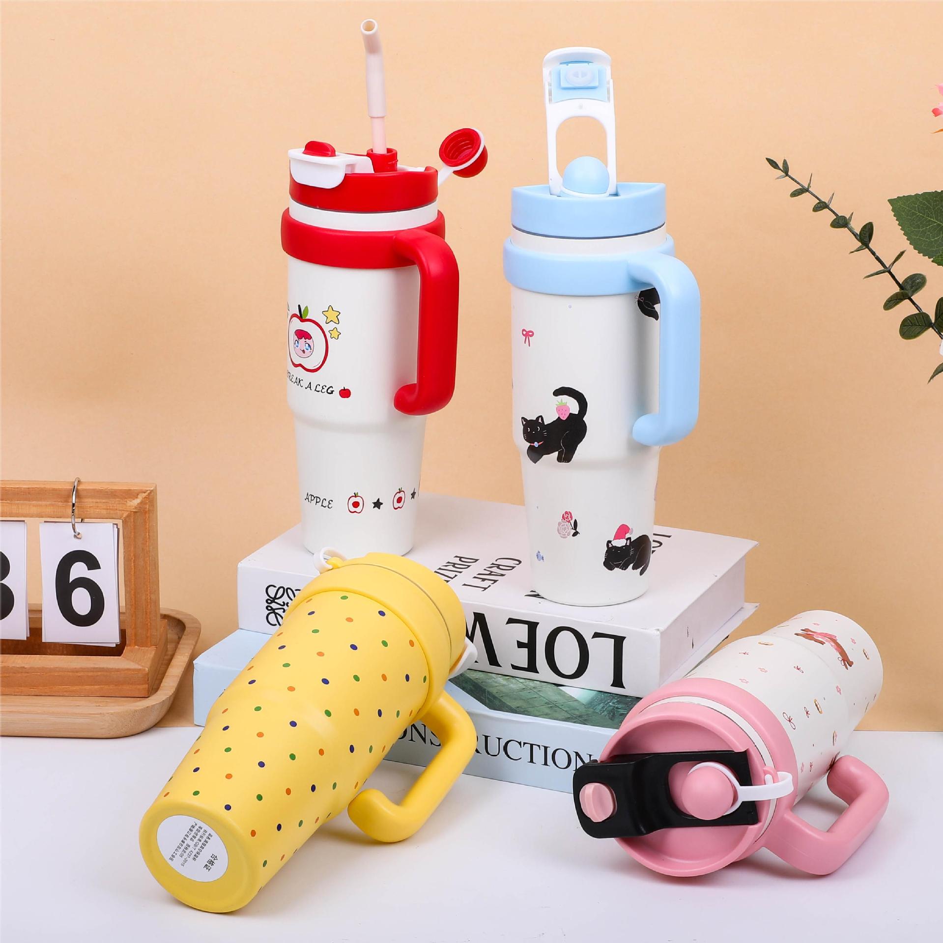 This insulated mug features charming black cat designs with cute elements like strawberries and bows. It comes with a convenient handle and a secure lid. You can choose from multiple styles, including different animal patterns and color combinations, making it a perfect companion for keeping your drinks at the desired temperature while adding a touch of cuteness to your daily routine.
